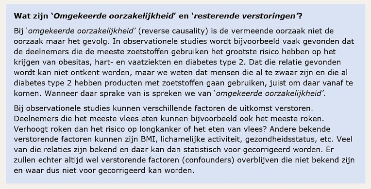 Een te hoge suikerconsumptie is een belangrijk gezondheidsprobleem. Het gaat dan met name om suikerhoudende dranken omdat die zijn geassocieerd met gewichtstoename, hart- en vaatziekten, hypertensie en diabetes type 2 [1-4]. Light dranken zouden daarvoor een oplossing kunnen zijn omdat die geen calorieën bevatten en dus niet tot gewichtstoename en de daaraan verbonden gezondheidsproblemen leiden. Observationele studies laten dat meestal niet zien, maar dat kan komen door de aanwezigheid van ‘omgekeerde oorzakelijkheid’ en ‘resterende verstoringen’ (zie blauwe kader). Interventiestudies laten tegenstrijdige resultaten zien, maar dat kan komen omdat light drank niet alleen met suikerhoudende drank is vergeleken, maar bijvoorbeeld ook met water. Het doel van light drank is juist om suikerhoudende dranken (lees calorieën) ermee te vervangen en niet water. Om nu meer duidelijkheid daarover te krijgen hebben onderzoekers een netwerk meta-analyse uitgevoerd waarin het effect van light drank is vergeleken met het effect van suikerhoudende drank en water afzonderlijk. De uitkomsten waarnaar gekeken is waren lichaamsgewicht en -samenstelling en uiteenlopende cardiometabole risicofactoren.