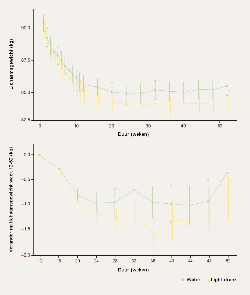Na 12 weken was het gewichtsverlies in beide groepen ongeveer 5,7 kg (zie tabel 1) [10]. De middelomtrek was wel sterker afgenomen in de groep die light drank dronk (5,9 versus 7,2 cm). Na 52 weken was het gewichtsverlies in de groep die water dronk toegenomen tot 6,1 kg (zie tabel 2 en figuur 2). De groep die light drank dronk had een gewichtsverlies van 7,5 kg, een verschil van 1,4 kg. Dit verschil was significant, maar de vraag is of het verschil ook groot genoeg is om relevant te zijn voor de gezondheid. De onderzoekers geven aan dat het verschil daarvoor ≥ 1,5 kg moet zijn. Deze gegevens zijn gebaseerd op deelnemers die de volledige 52 weken hadden afgerond. Er was echter een behoorlijke uitval van 47%, waardoor er missende gegevens zijn. Daarom zijn er twee alternatieve analyses uitgevoerd. In één complexe analyse zijn de missende gegevens met een ‘voorspellend gemiddelde’ ingevuld. Het gewichtsverlies was dan respectievelijk 6,3 en 7,1 kg. In een andere analyse zijn van de uitvallers de laatste gegevens als definitief beschouwd (last observation carried forward). Iemand die bijvoorbeeld na 40 weken afhaakte en toen een gewichtsverlies had van 3,0 kg, werd berekend als een gewichtsverlies van 3,0 kg na 52 weken. Het gewichtsverlies was dan respectievelijk 4,9 en 5,5 kg. In beide alternatieve analyses was er geen significant verschil tussen de twee groepen.